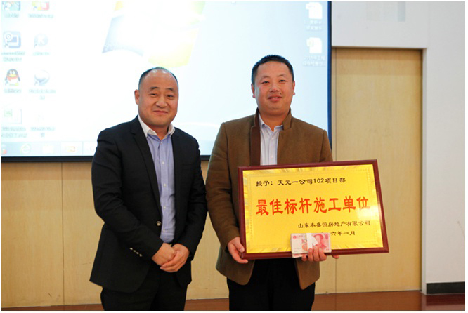 會上,公司副總經(jīng)理、質(zhì)量檢查組組長班磊以PPT的形式,結(jié)合各項目日常表現(xiàn)總結(jié)分析了2015年度工程檢查中各項目體現(xiàn)的亮點和不足。并對表現(xiàn)突出的金泰華府南地塊27#樓承建單位天元102項目部進行了表彰。