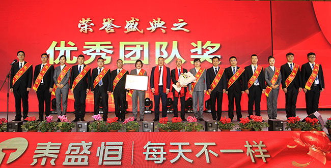 會上,對2017年取得突出成績的優秀團隊及個人,以及在公司工作五年以上的老員工進行了隆重表彰,公司高層領導分別上臺宣布了獲獎名單并為其頒獎。其中,泰盛廣場項目獲得優秀項目獎、營銷管理中心和招采管理中心獲得優秀團隊獎,孫董為獲獎團隊頒獎了榮譽獎牌。成績只代表過去,希望獲獎的團隊及個人在新的一年里戒驕戒躁、再接再厲,充分發揮模范帶頭作用,為公司發展再立新功。
